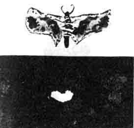 „Diese Bilder aus dem Hades alles schwarz und … haben selbst gebildet sich mir zum Schrecken einzig nur aus Tintenflecken.“ Zitat Kerner, der frühe Klecksografien, später wird man Décalcomanien sagen, fertigte. Mit ein paar Federstrichen kann man der Deutlichkeit, der Erkennbarkeit nachhelfen. Dieses Werk erinnert an archaische Kunst, und zeigt „Spuren“ der Person, der die Kleckse deutet und ergänzt.